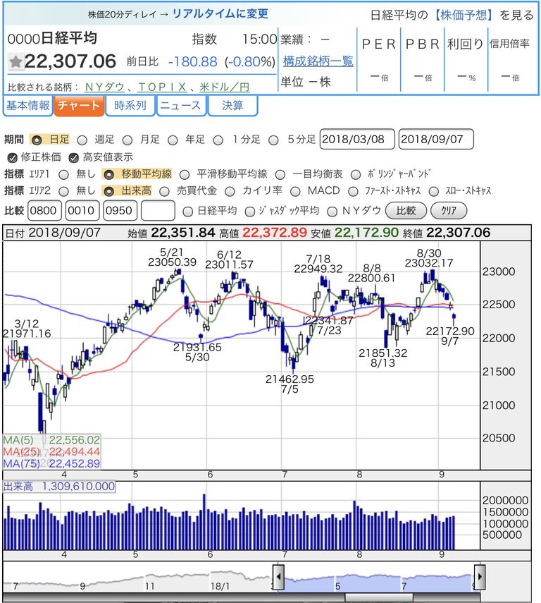 9/7(金)の日経平均終値は前日比180円安、前週比558円安の22,307円でした。