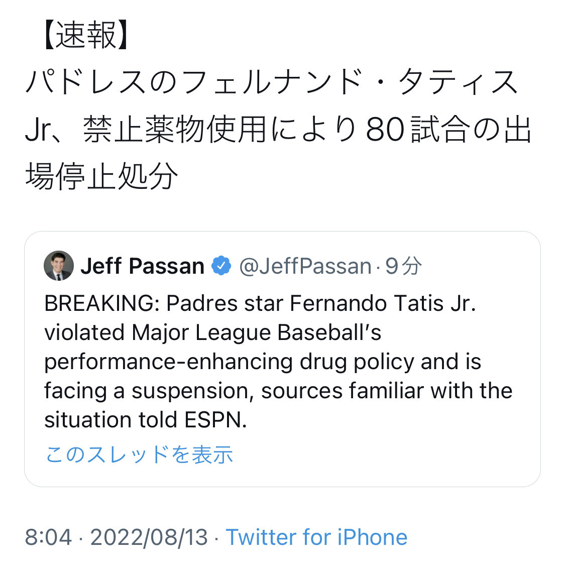 フェルナンド・タティスJr、終わる 禁止薬物使用で80試合出場停止