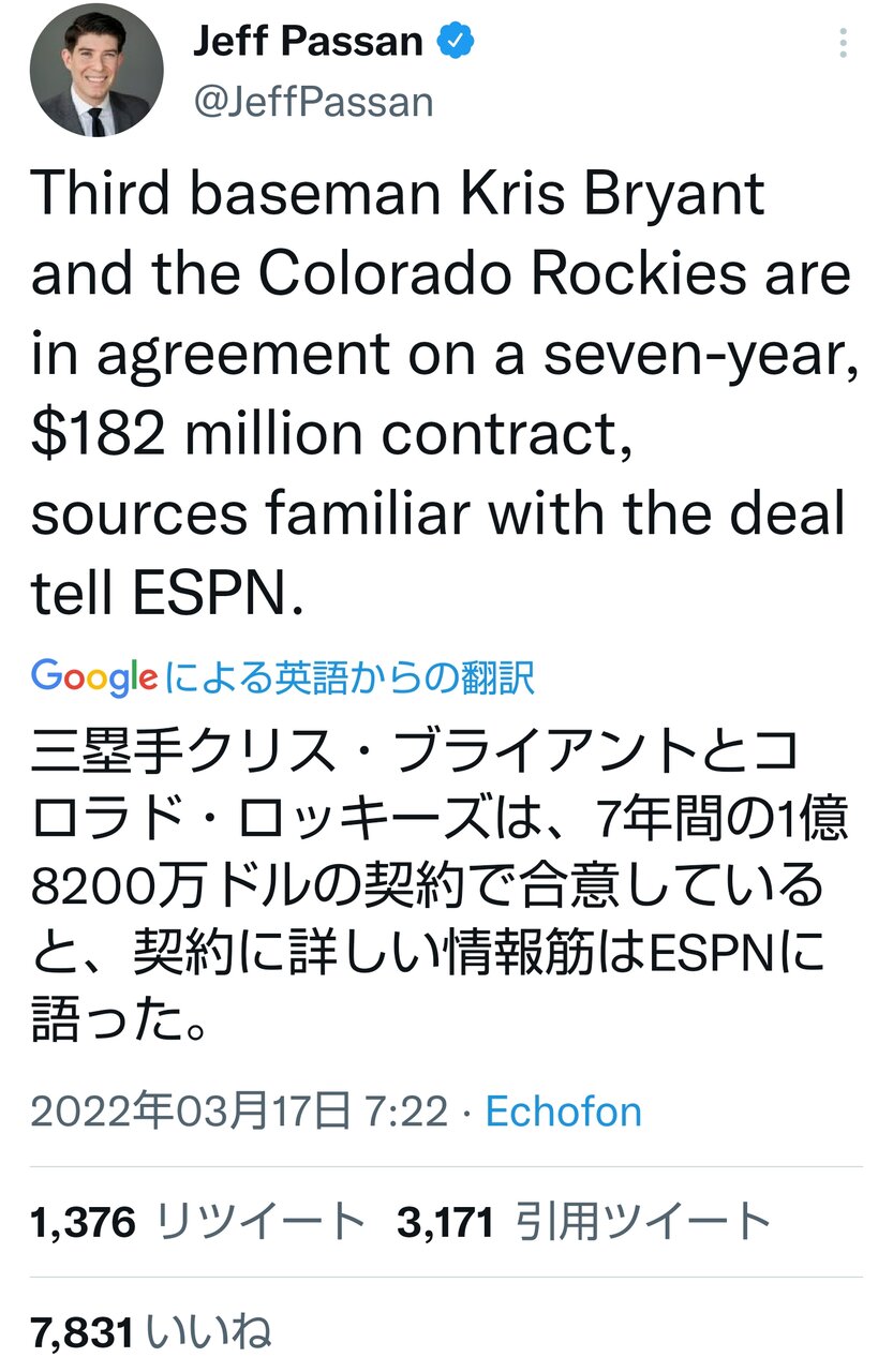 クリス・ブライアント、ロッキーズと7年210億円で合意報道