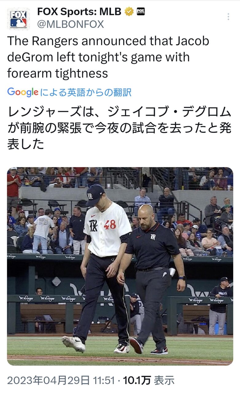 【悲報】TEX ジェイコブ・デグロムさん好投の中、突如逝ってしまう