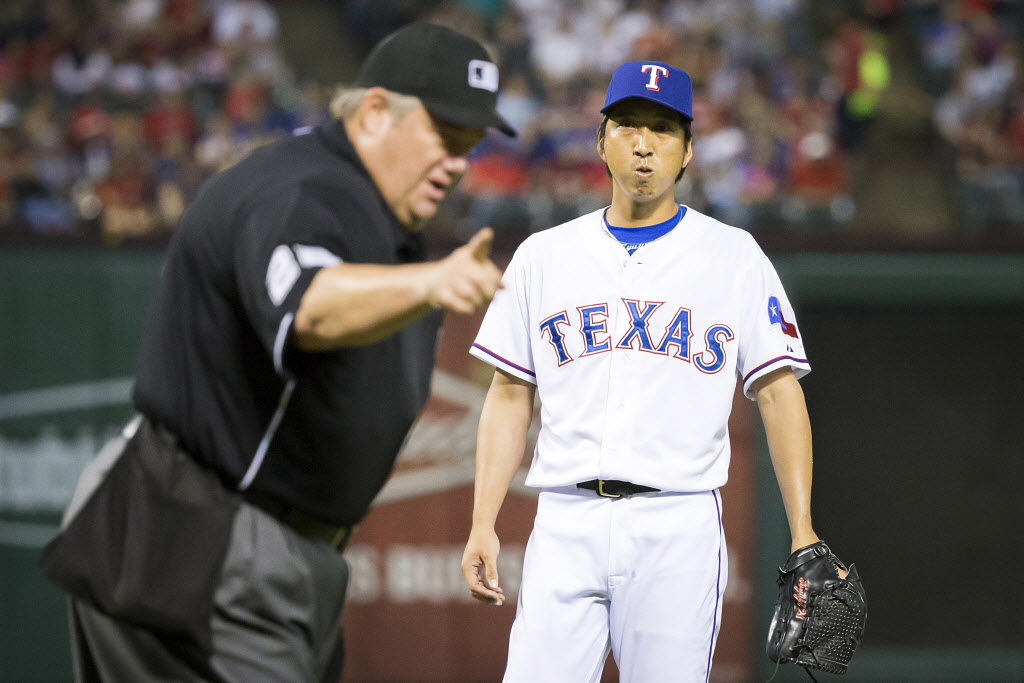(ジョー・ウェスト球審が、レンジャーズ・ベンチと藤川に危険球の警告を与える。2015年5月15日、対インディアンズ戦。)