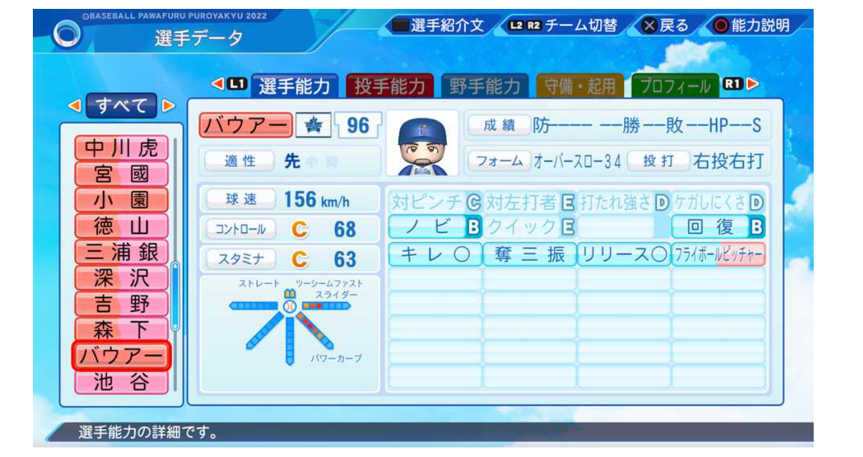 バウアーさんのパワプロの能力が判明