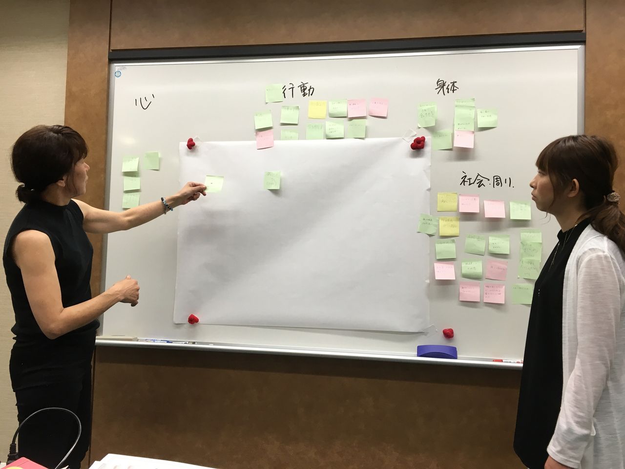 ホワイトボードに「心」「行動」「身体」「社会(周り)」