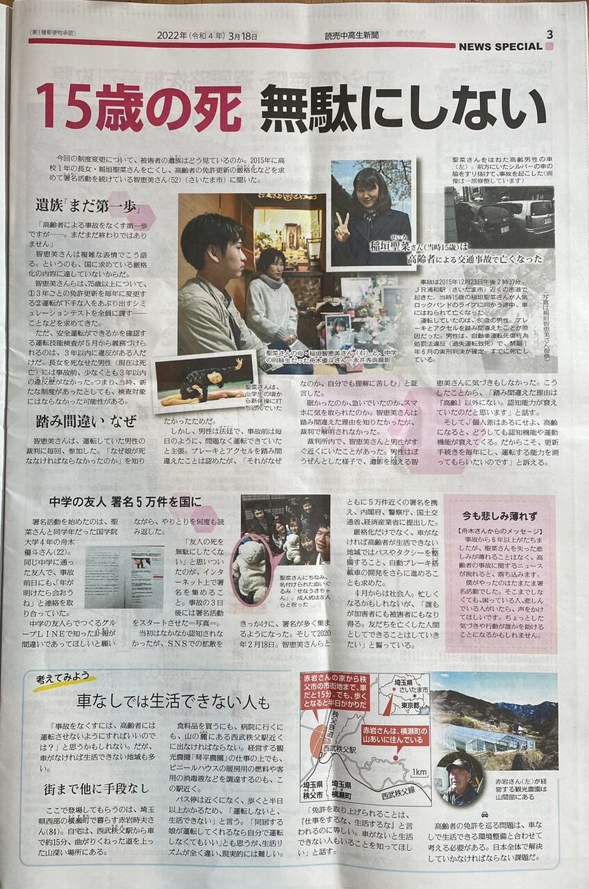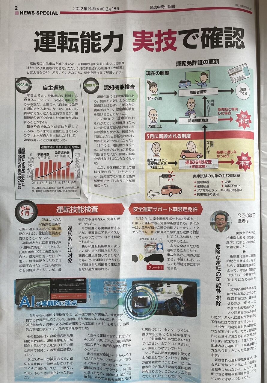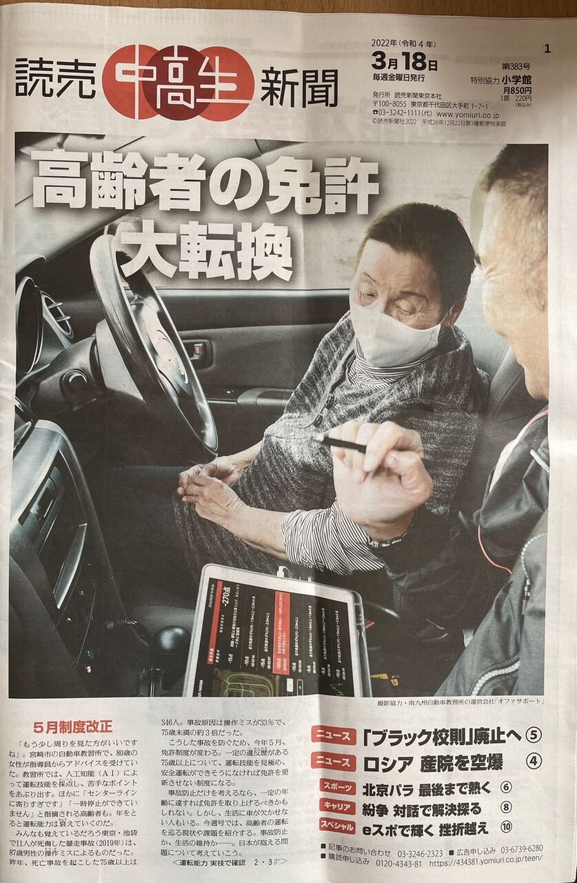 高齢者免許についての読売中高生新聞記事(2022.3.18)