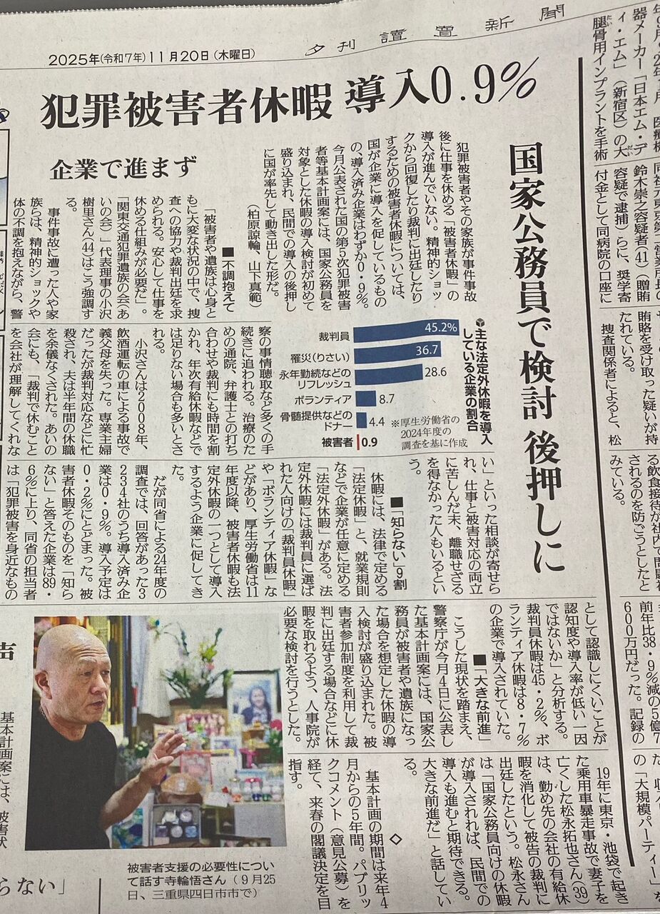 11月20日の新聞で、犯罪被害者や遺族が裁判・捜査対応・心のケアのために取得できる