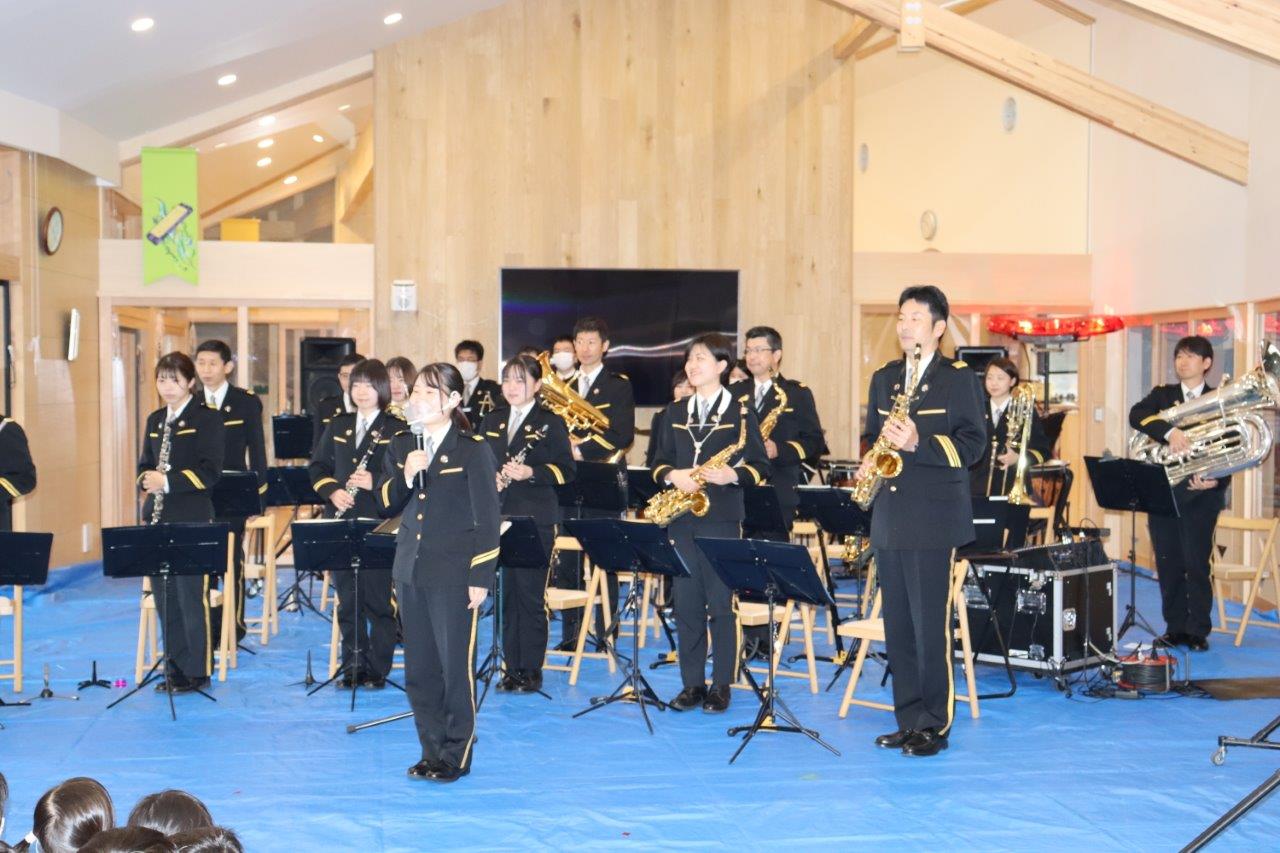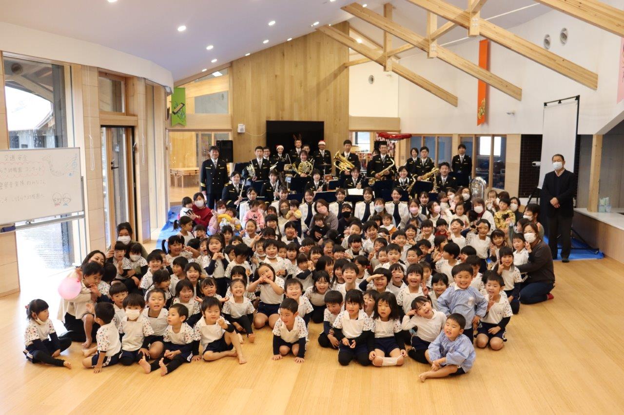 2021年12月08日 音楽隊がやってきた‼ 今日は、「茨城県警察音楽隊」の皆さんが迫力満点の演奏会をしてくれました。 身体にドスンという感じと、映像や手遊びなどアッという間の一時間でした。 それから、知ってる曲の子ども達の歌声が、とっても良かった クリスマスソング最高