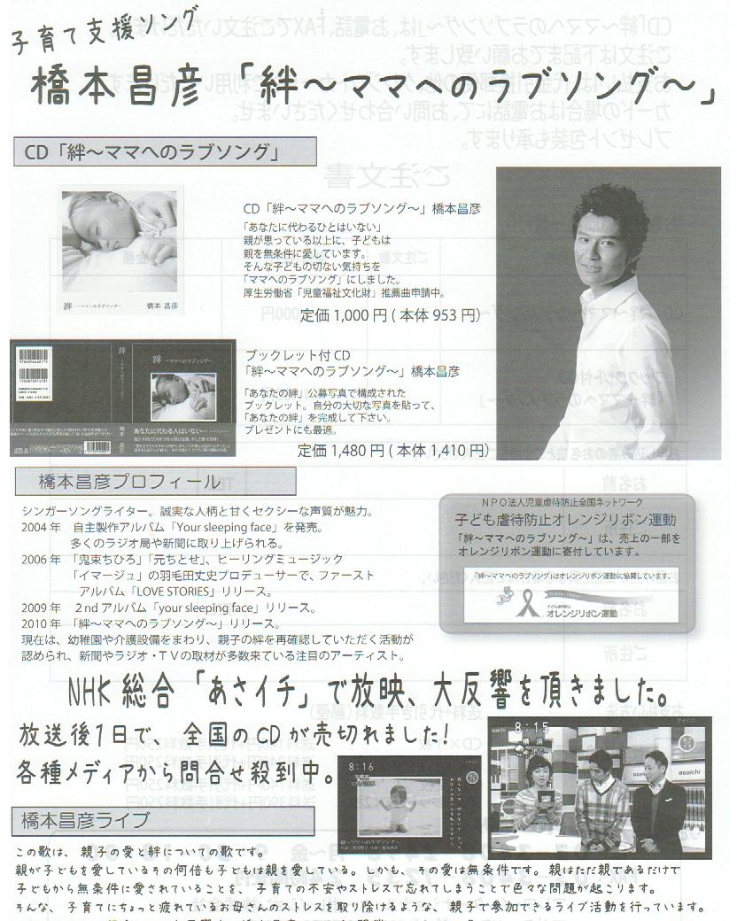 で、話しは変わりますが、3月に歌手:橋本昌彦さんを奈良県にお呼びして「生ライブ」で絆~ママへのラブソング~を歌っていただきます。