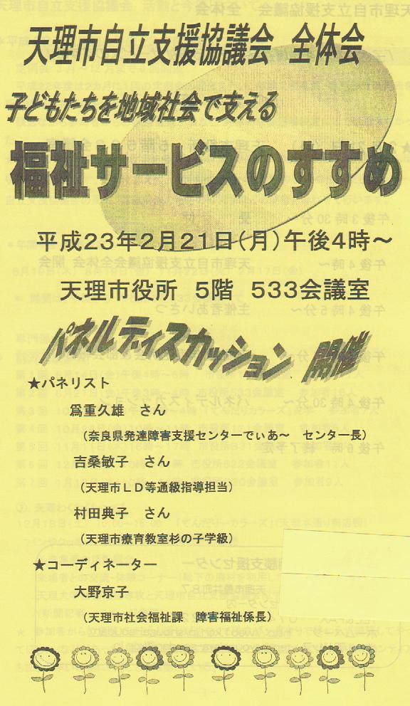 午後4時からは、毎回参加している「天理市自立支援協議会」の会合へ。今回は、全体会としていつもの報告に加えパネルディスカッションが開催されました。