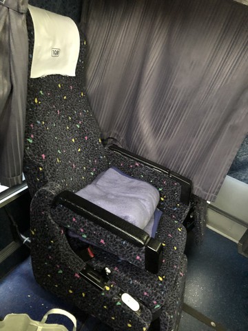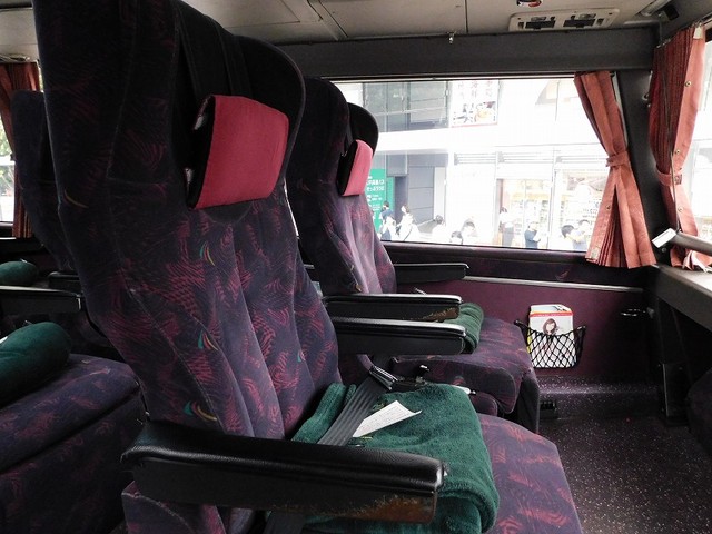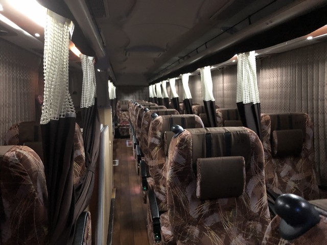車内は3列シートトイレ付。プライベートカーテンもしっかりしたものが付いていて快適そのものです。