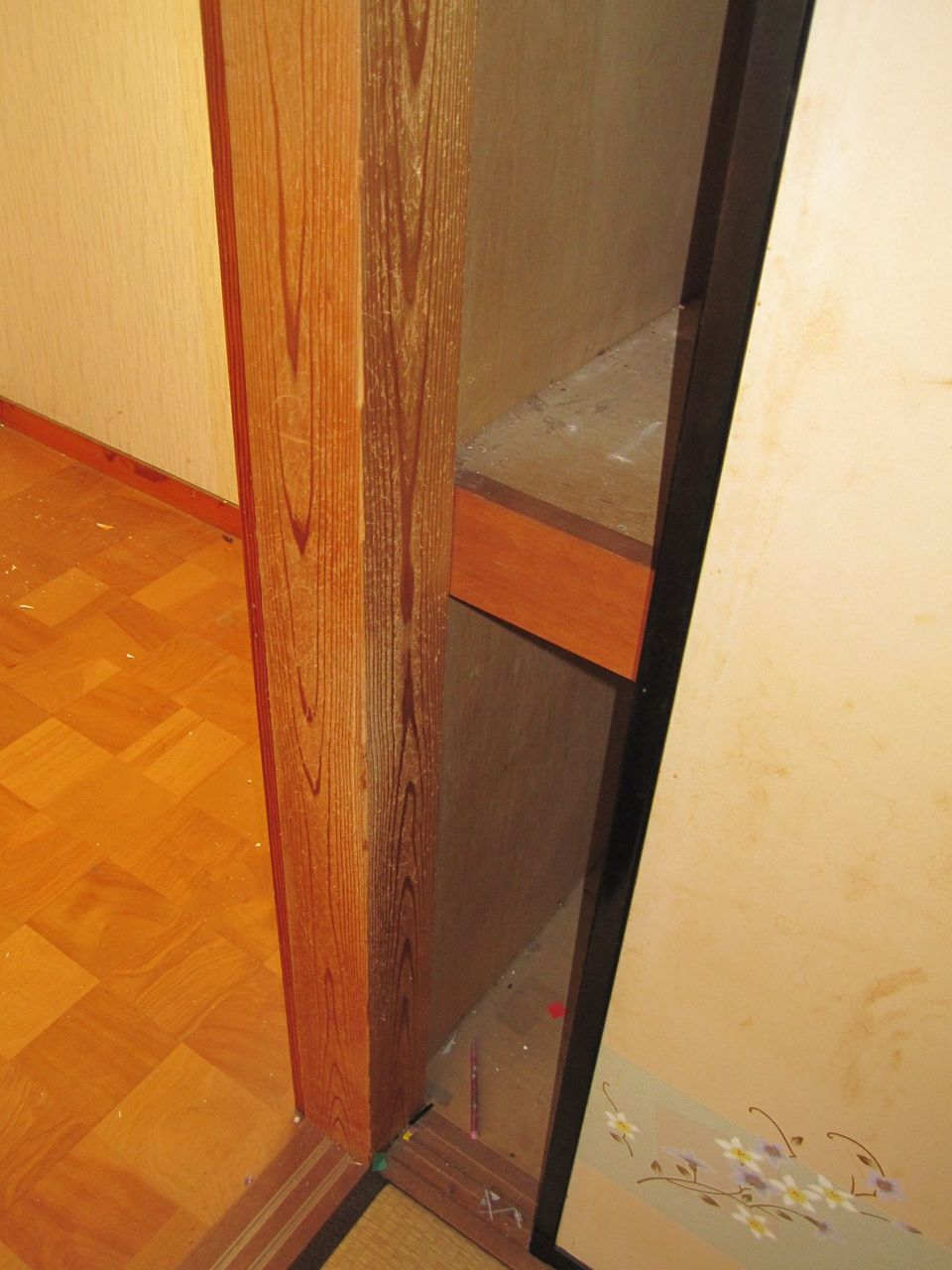 大家さんからは「入居期間が長いし、破れた障子もそのままなので、中がどうなっているのか心配です」と聞いていたので、どのように痛んでいるか興味がありました。しかし、中はそれほどではなく、期待はずれでした。(破損、汚れが多いほど仕事が増えて、当社としては良いのですが)