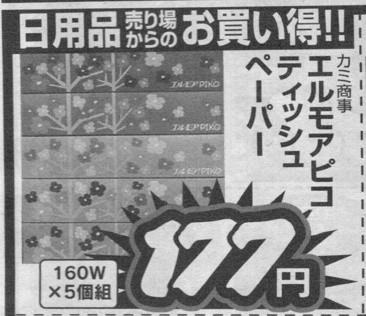 ティッシュ、それもボックスに入って5個一組で売られているものです。昔からテッシュはスーパーでの安売の目玉商品でした、今も変りません。その値段ですが、私の記憶が正しければ、数年前は198円ぐらいで良く出ていました。しかし、その後、原料のパルプの値上げが等があり300円弱まで値上りしていたと思います。しかし、最近になって198円とか178円の広告を見かけるようになりました。ただ、最近のテッシュ一箱は入枚数が減って箱自体が薄くなっていますので、昔とは単純に比較は出来ないかもしれません。しかし、ここ最近、売価が下がっていることは間違いないと思います。それで、少し前にディスカウントスーパーのプライベートブランドテッシュを買って見たのですが、紙のさわり心地などが良いのです。少し前までは安いブランドのテッシュは紙質が悪く、ごわごわした感じがありましたが、それがありません。このあたりも、大手ブランドの商品が安く売られているのに関係しているかもしてません。何れにしても世の中はデフレなんですよね。安いことは良いことかもしれませんが、安すぎることは結局我々にはね返ってくるので良くありません。でも、安いものがあるとついつい手が出てしまいます。これが、何れは自分自身の首を絞めることに繋がることを知っていてもやめられません。安売はほどほどにして、その商品に対して適正な金額は出すべきだと思います。これ、でも難しいですよね。やっぱり、安いのには手が出てしまいますよね。