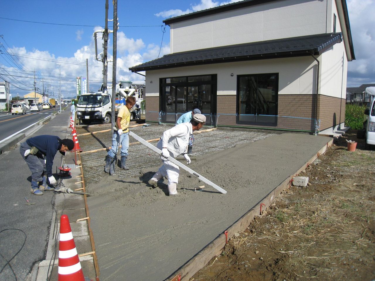 全体にコンクリートを入れ終え、最初に打った部分から仕上げの押えをし、ほうきで掃いて仕上げます。