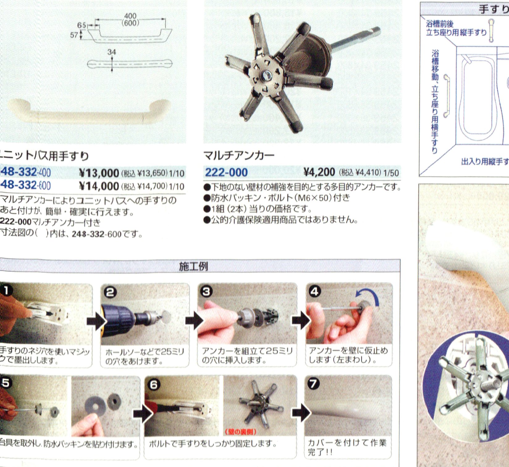 手摺もう一つはカクダイから出ている「ユニットバス用マルチアンカー」です。これは、壁に直径25ミリほどの穴を明け、浴室側から金物を入れ、裏側の足が広がりボルトを固定することが出来るものです。