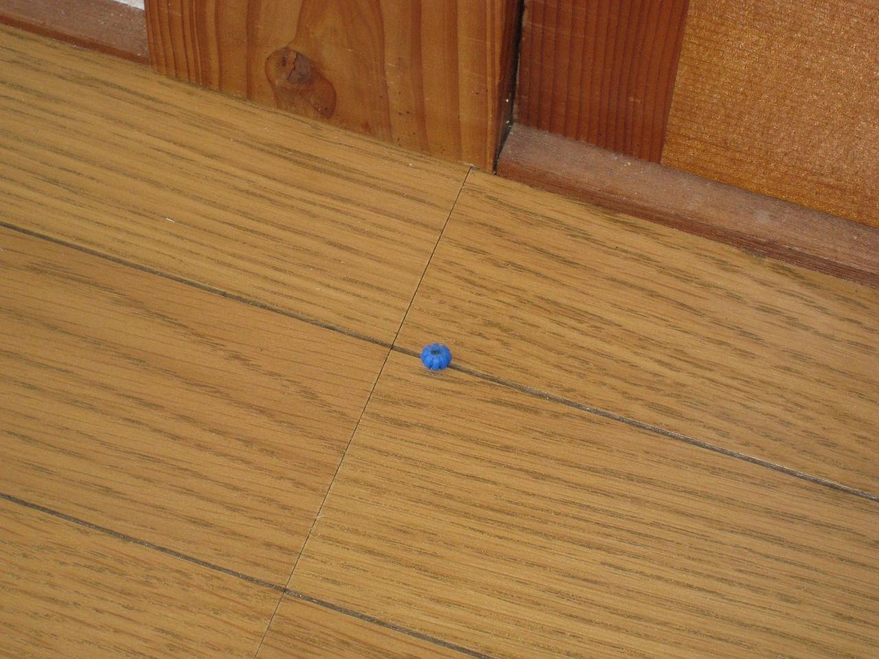 カラーフロアーは釘と接着剤を併用して固定しますが、周囲部分は釘が打てないところがあります。その場合は仮止めの釘を打って接着剤が固まるのを待ちます。画像の青い頭が仮釘です。接着剤が固まった後は、青い部分を横方向から叩くと頭だけが折れて取れるものです。