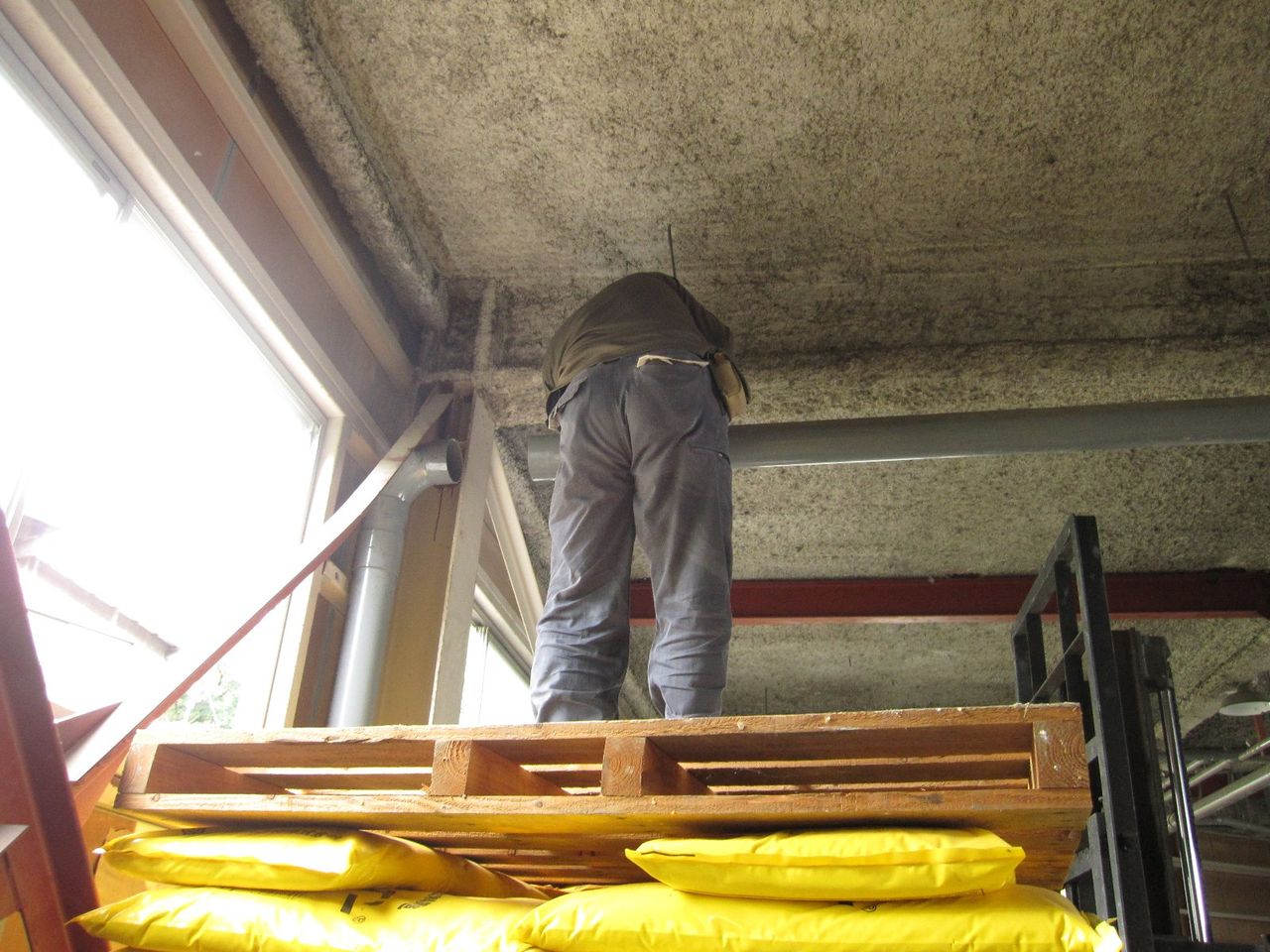 今日の修理は1階の天井下に釣ってある排水管をフォークリフトで押して、配管が壊れたものでした。もちろん、水道工事と言えば塩井さんの出番です。幸い、今日は事務所近くで仕事をしていましたので、そっちは後回しにして修理へと向ってもらいました。破損の程度としては、横管が縦管に接続するエルボ部分の1箇所でしたので、約2時間ほどで修理が完了しました。修理が完了するまでは2階の事務所でトイレが使えず困っていらっしゃいました。比較的短時間に修理が完了したので、事務所の方からも喜んでいただけました。この様に、水道関係の修理は短時間に終ることが一番大切で、水、トイレが使えないのは大変困るのです。