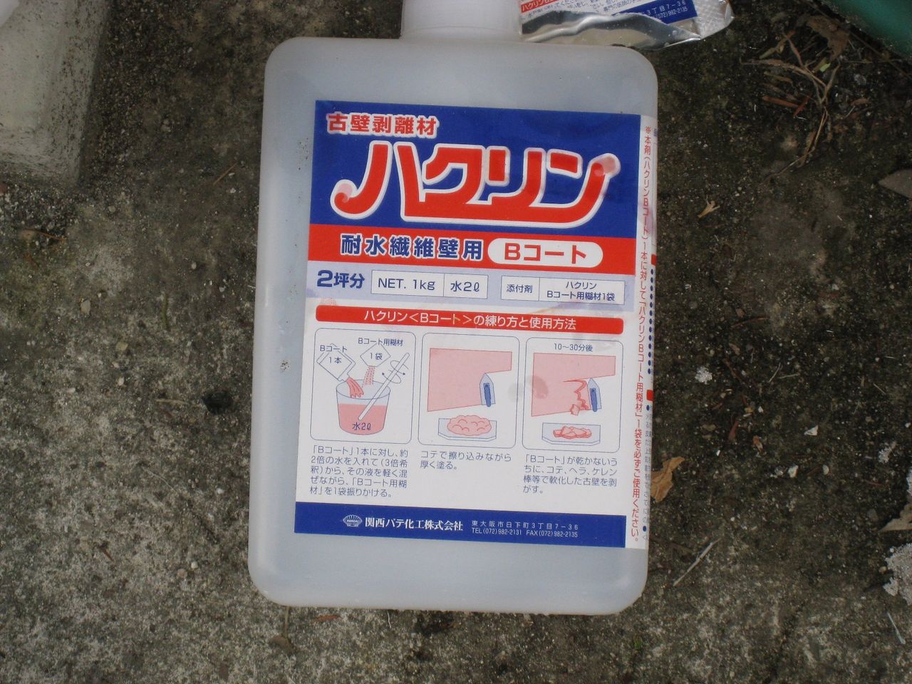今回使用した塗り壁剥離剤です。これ一本で2坪剥取ることが出来ますが、値段は1600円するそうです。今回は剥取る面積が60平米ほどあり、この剥離剤を11本使用したそうです。計算すると結構な金額です。