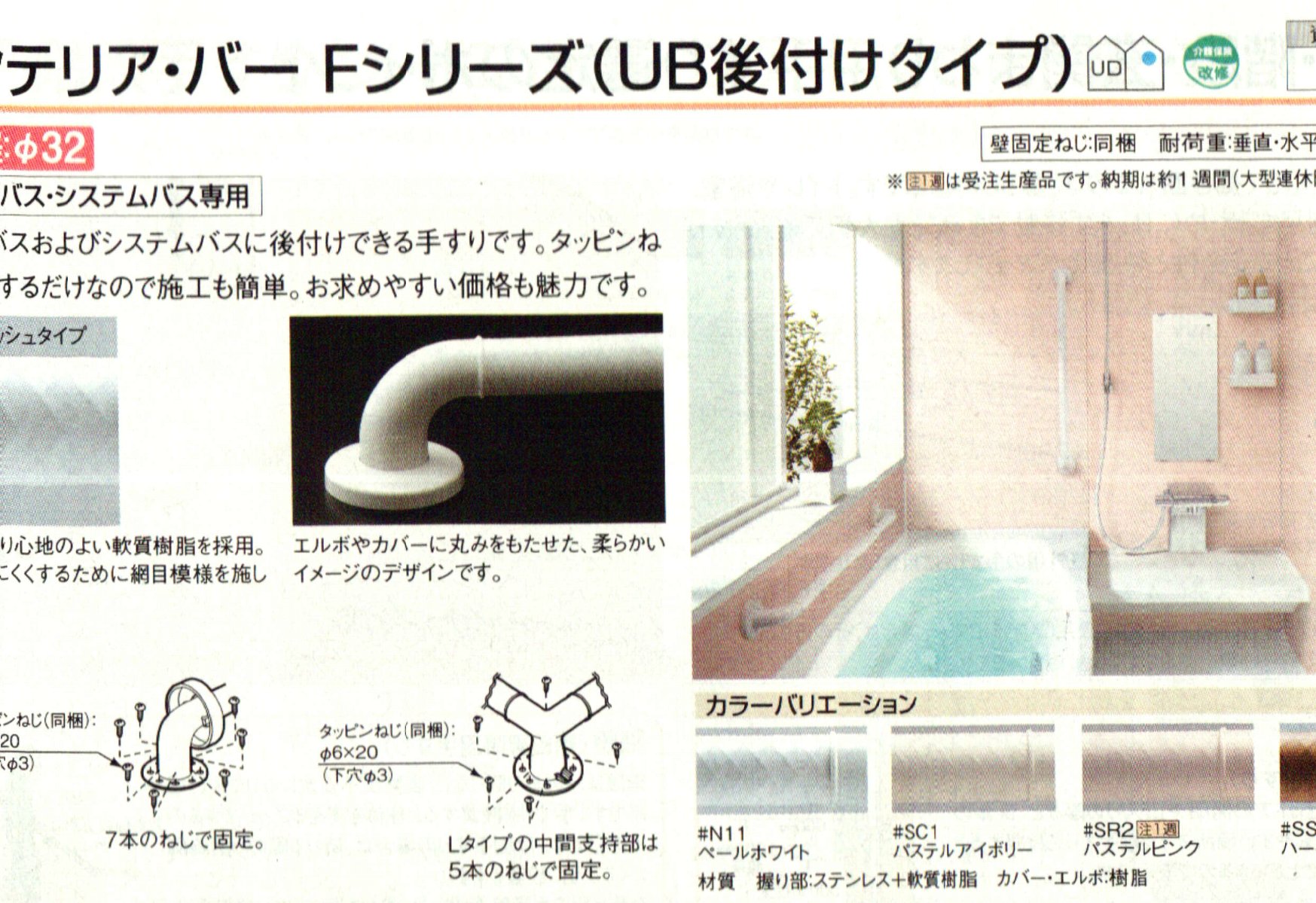 ここで本題です。今回のお宅もこのユニットバスに手摺と取付ける必要が出たのです。手摺について色々カタログを見ていると、この様なユニットバスに取付ける手摺が出ているのです。一つは、TOTOから出ている「UBバス後付タイプ」の手摺です。これは壁仕上げである鋼板に効くタッピングビスを使用し金物を止めるタイプです。