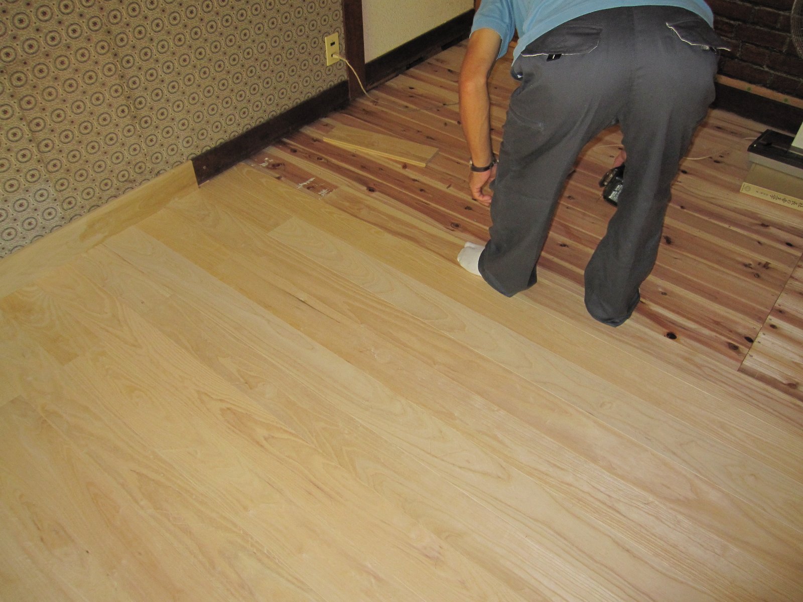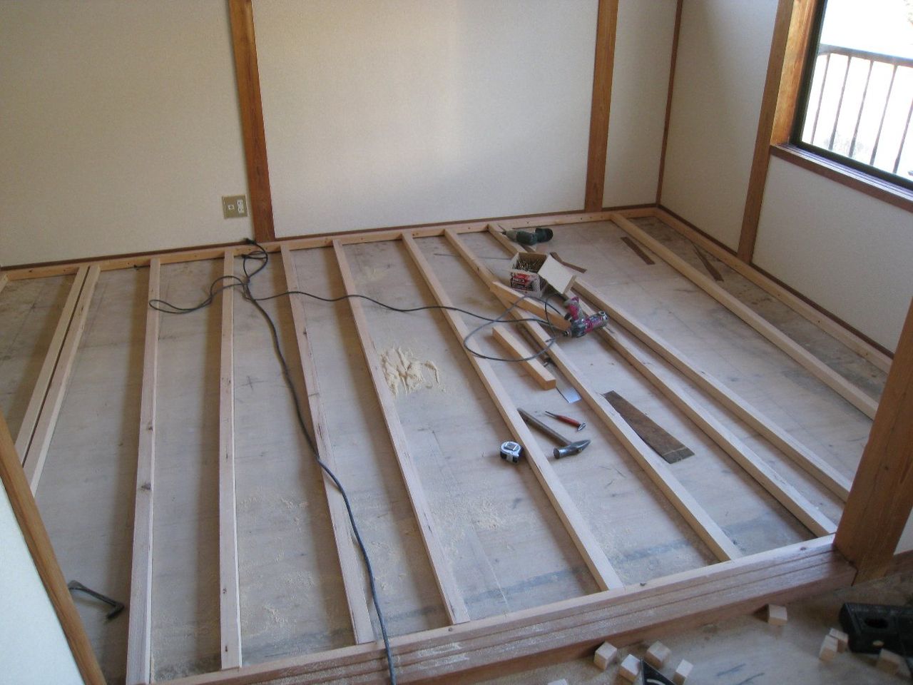 畳を取った後、敷居とカラーフロアーが同じ高さになる様に下地を入れます。この場合、元からある根太と直行方向に入れます。