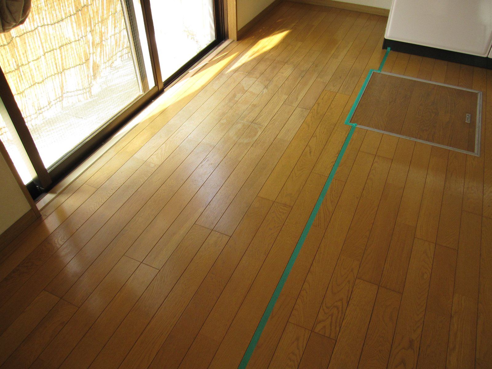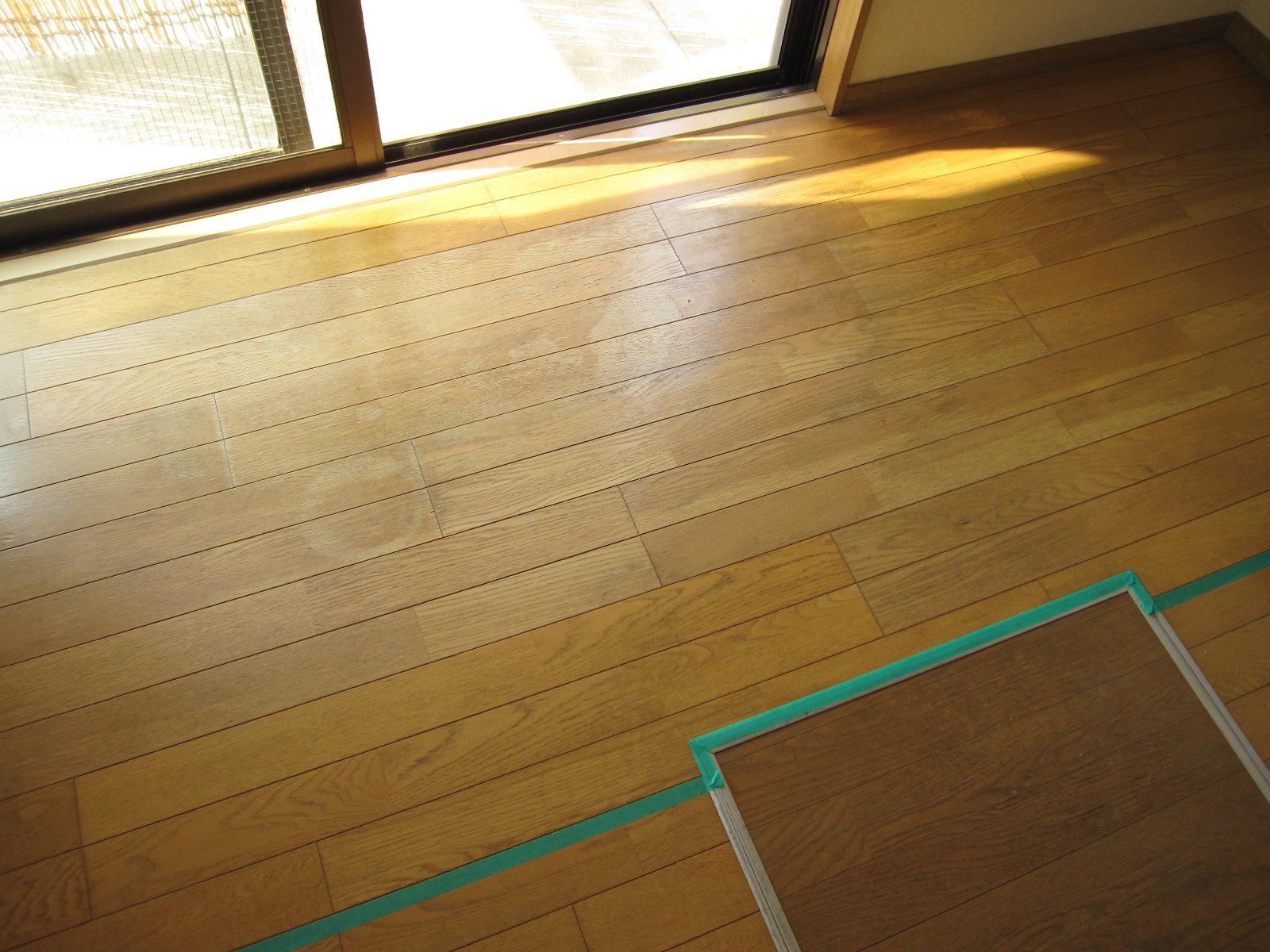 画像のように窓際から1メートル程度の目地で見切ります。窓の前部分で床がはげているのが分ると思います。