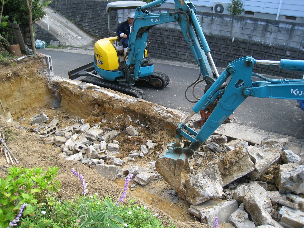 根切終った後、土留の間知ブロックなどを斫って解体します。結構コンクリートが厚く大変なようでした。