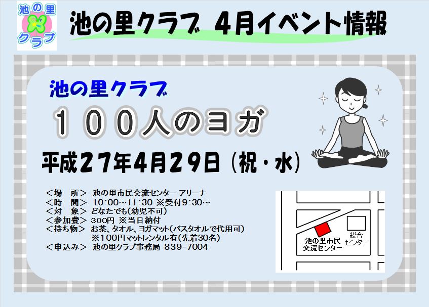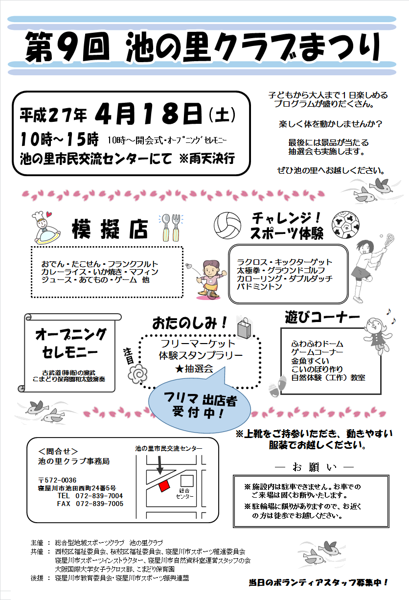 H27.4.18(土)10:00~15:00池の里クラブまつりスポーツ体験・模擬店・遊びのコーナーなど子どもから大人まで1日楽しめるプログラムが盛りだくさん。