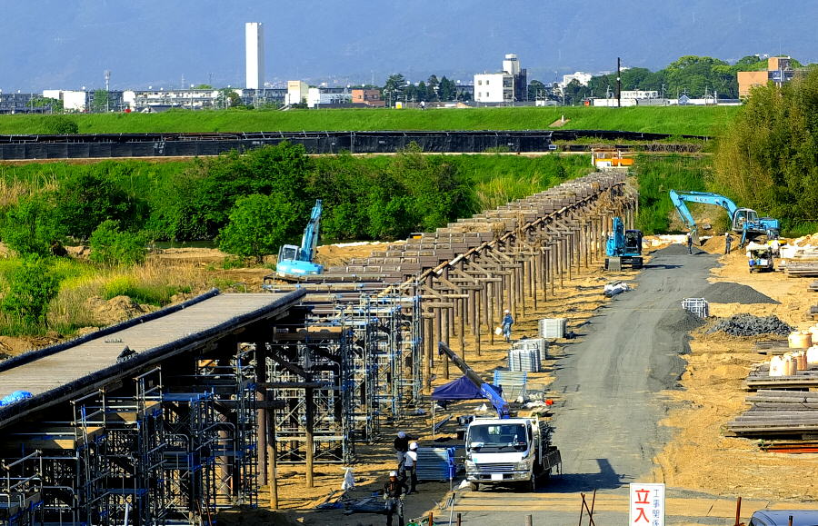 良い天気の一日となりました。連休に入ったので午後から木津川の流れ橋の修復工事の様子を実にてかけてきました。まだ工事は始まったばかり連休中には間に合いそうにはありませんでした。周辺を歩いてスナップをしてから戻りました。画像は、木津川堤防から見た流れ橋の修復工事の様子です。 京都府八幡市上津屋宮前川端、木津川堤防より。