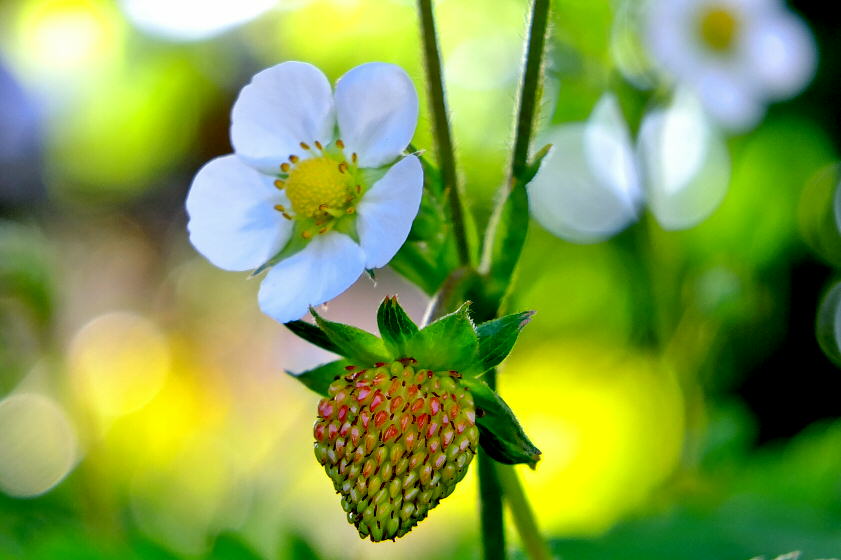 民家の垣根で咲いていたイチゴの花とまだ固い実。 京都府八幡市上津屋浜垣内付近の民家。