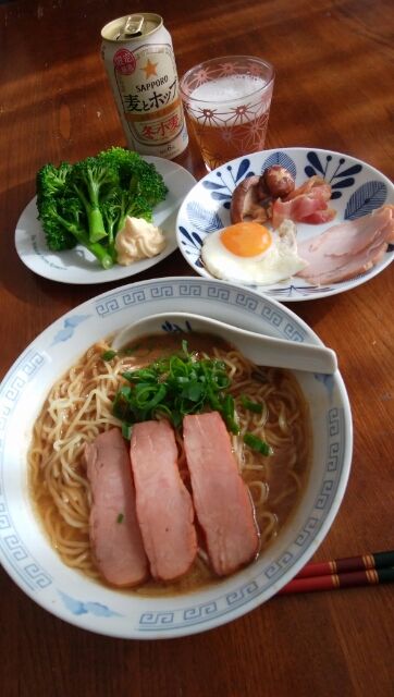 行列ラーメン、目玉焼きとハムと椎茸ソテー、ブロッコリー