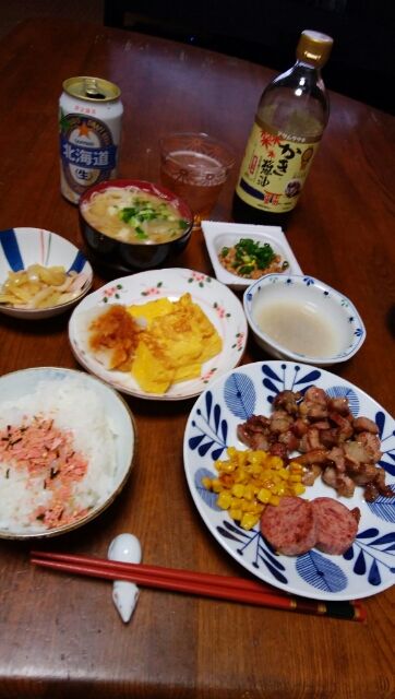 1/8(水) 晩ご飯親鶏のスパイス焼き、ハムソテー、とうもろこしソテー、丸武の玉子焼き、白菜の炒め物、おろし大根