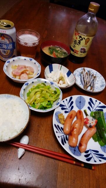 1/6(月) 晩ご飯シャウエッセンとピーマンのソテー、かたくちイワシ、キャベツのカレー炒め、山芋短冊、白菜とソーセージの炒め物