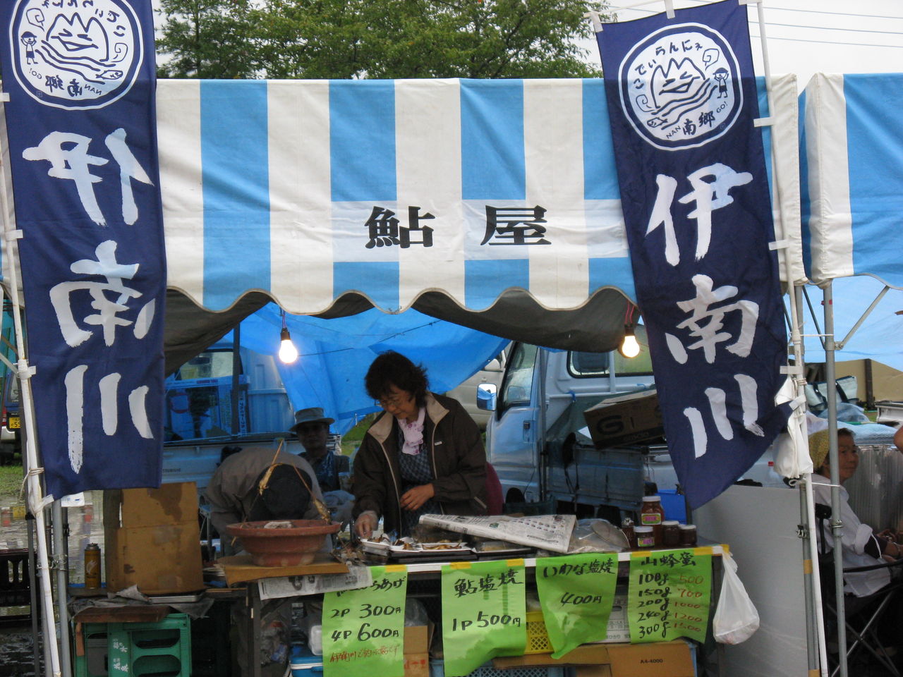 南郷支部恒例のシーズン後半のメーンイベント 豊年まつりに出店 支部長はじめ役員が応援 日頃の感謝をこめ伊南川のあゆの塩焼きを提供 途中雷雨の襲来 鮎たちも水が恋しかったのか? 伊南川のあゆまだまだ楽しめそう