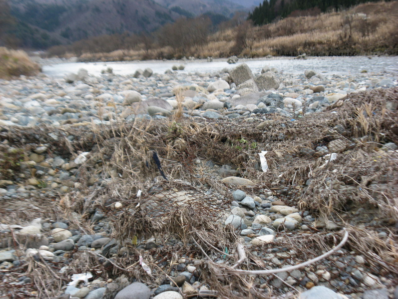 蛇籠(じゃかご)堰の残骸、針金がむき出しの状態