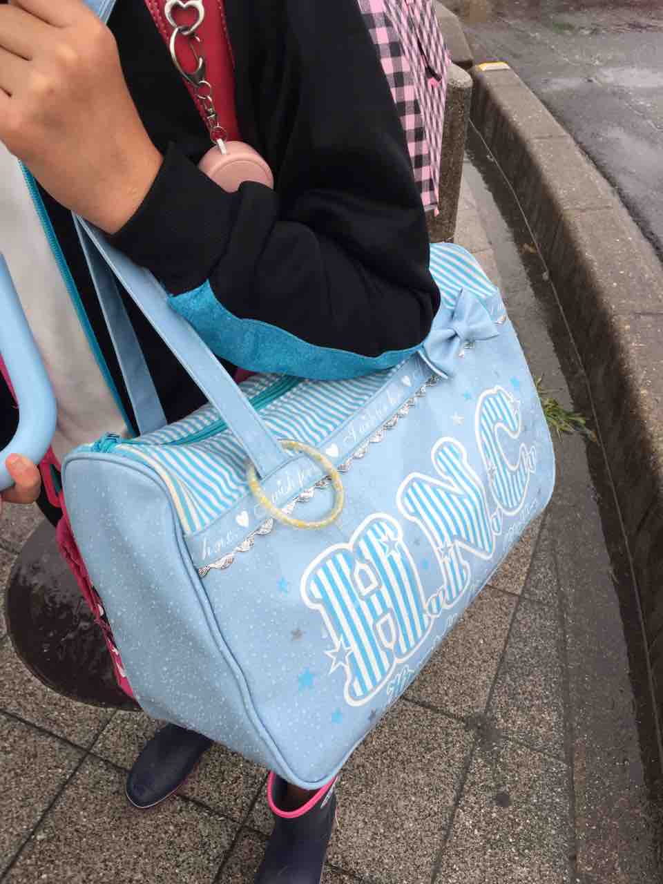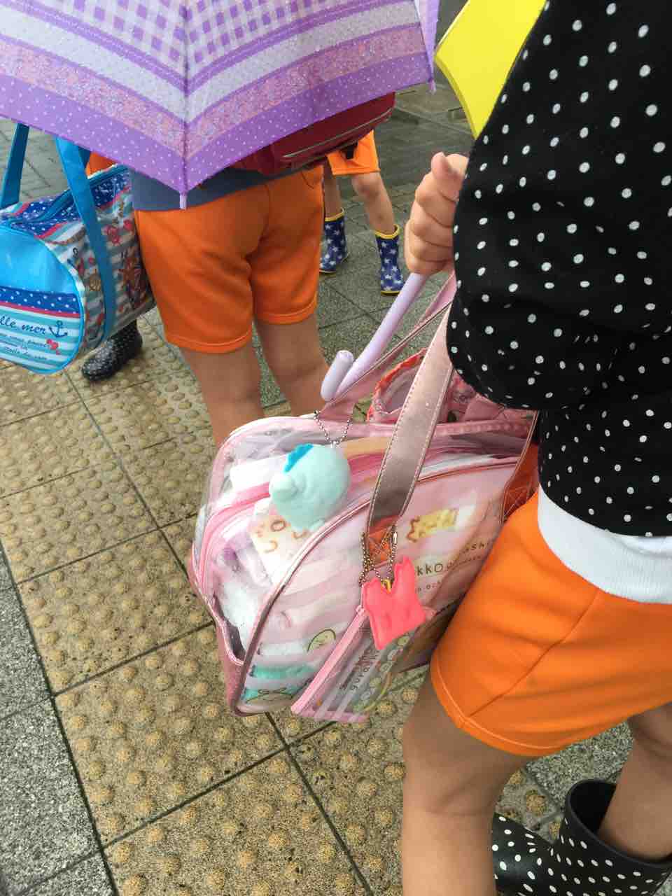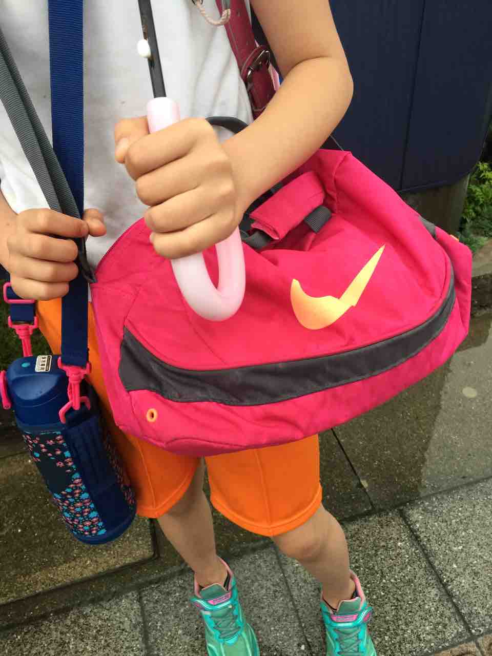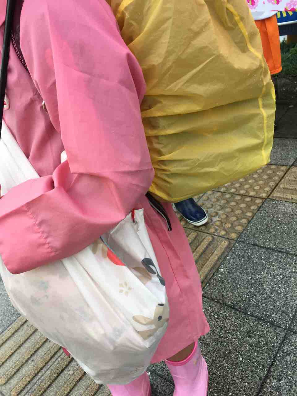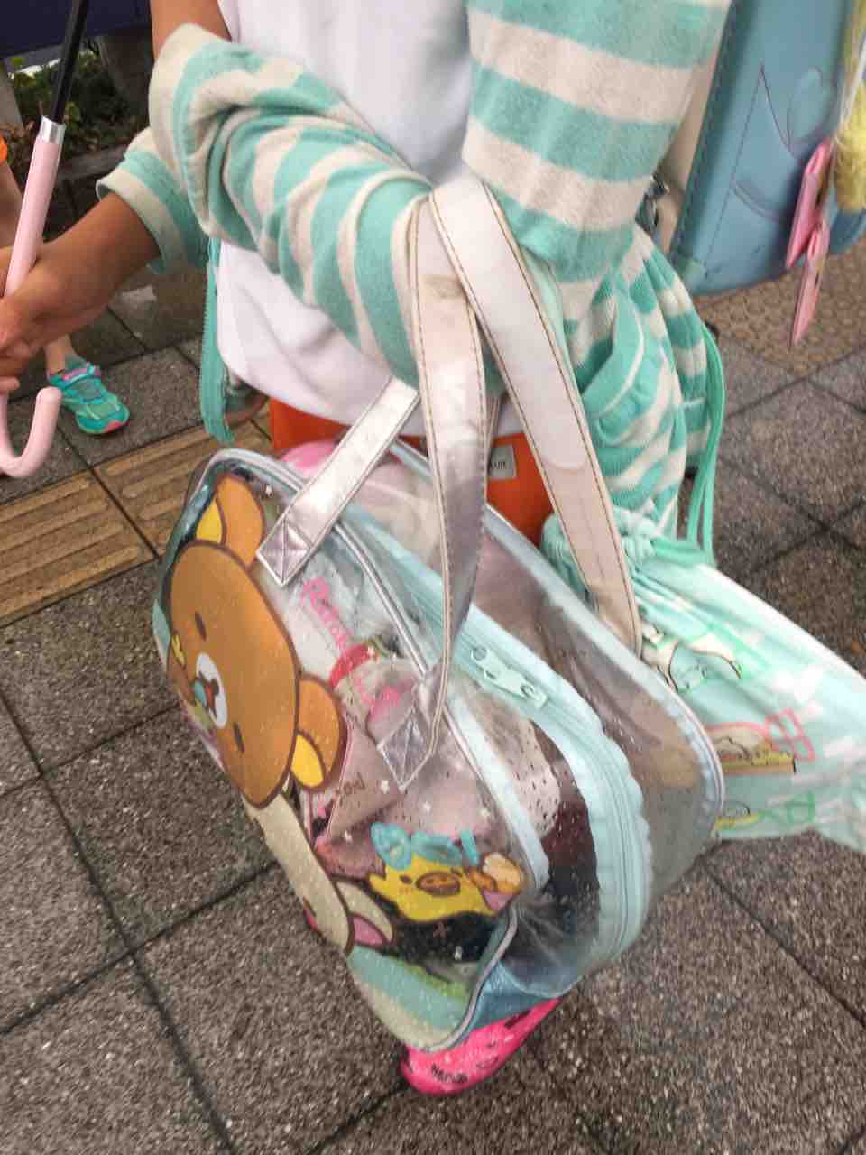 雨のためプール授業も無いと思われる日でも大きな荷物で身体がグルグル巻き。
