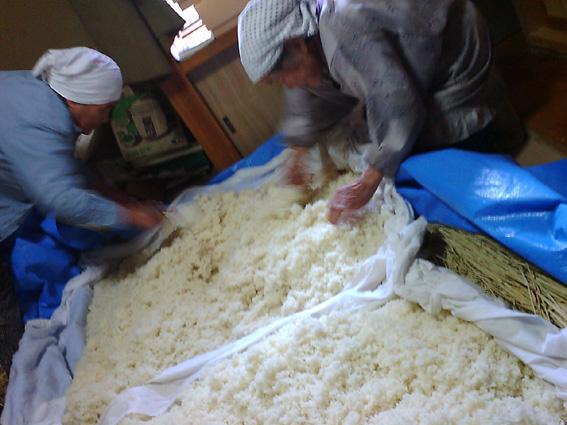 蒸し米にして麹を加える。