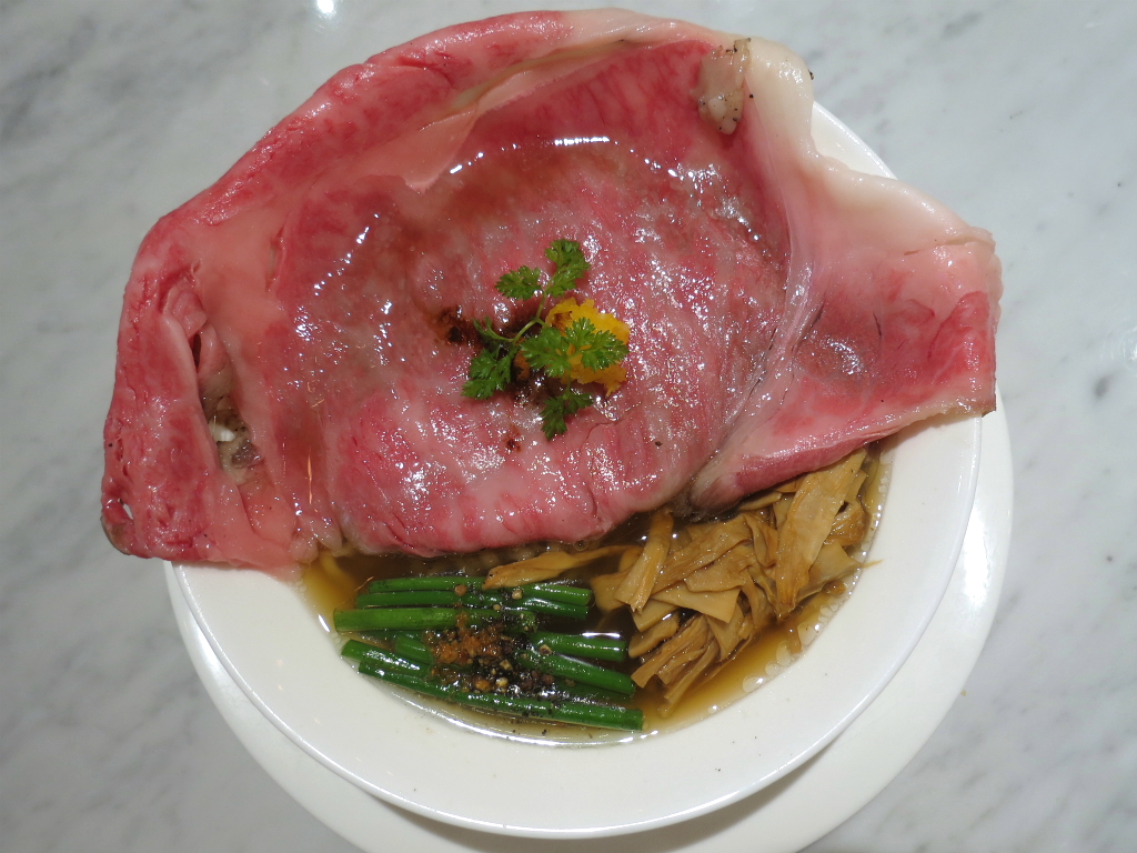 さて、「A5黒毛和牛醤油らぁめん」。彼のサッカー選手デビット・ベッカムがプライベートジェットで食べに来たとされる一杯。