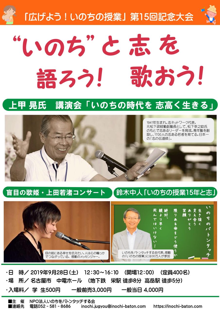 今回は、「いのちと志」。日本一の志の伝道師:上甲晃氏の講演、盲目の歌姫:上田若渚さんのコンサート、鈴木中人:いのちの授業15年の思い。感動と笑顔のお届けします。