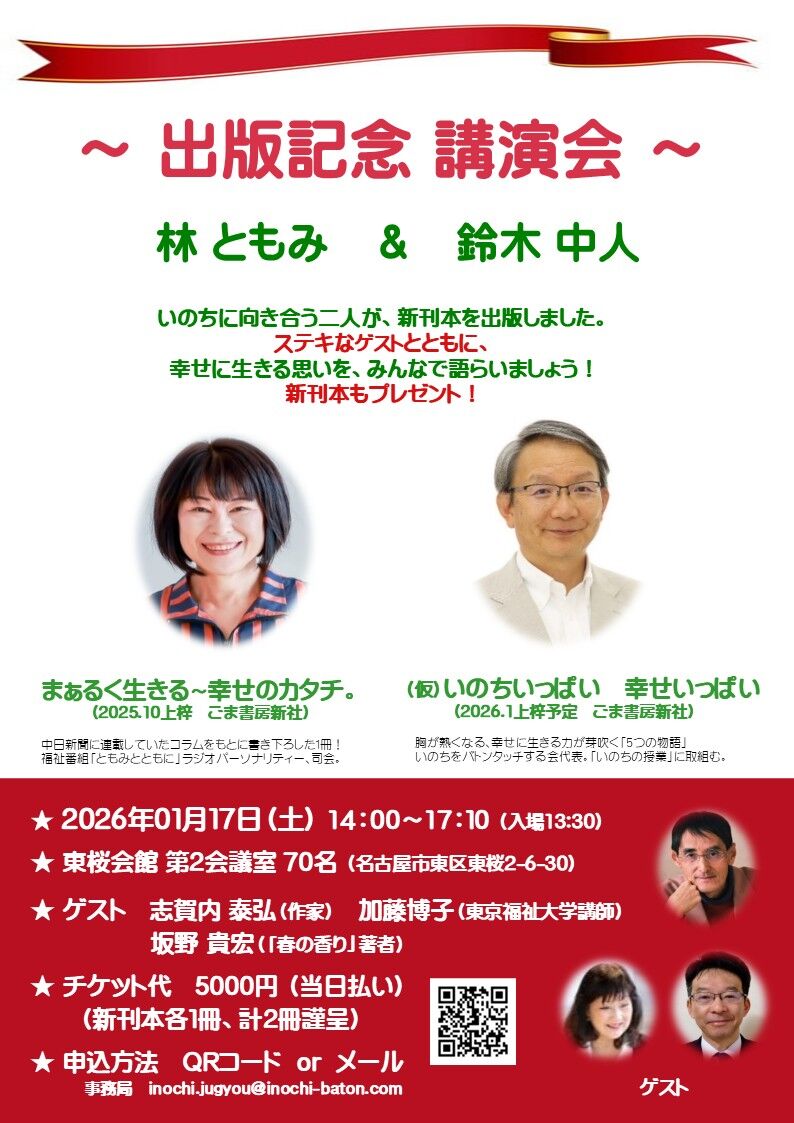 その第1弾は、「林ともみ&鈴木中人出版記念講演会」(1/17,名古屋)です。林さんは、重度障がいの娘さんとの人生を書き下ろした「まぁるく生きる〜幸せのカタチ。」を上梓。ステキなゲスト(志賀内泰弘、加藤博子、坂野宏貴)もご参加です。