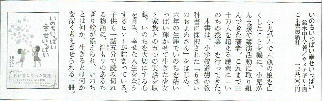 「いのちを大切にする心を育み、幸せな人生を全うするヒントが詰まっている。温もりのあるちぎり絵が添えられ、いのちとは何か、生きるとは何かを深く考えさせられる一冊」