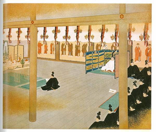 そこで、総裁局顧問の木戸孝允は、天皇が群臣を率いて国是を神明に誓う、という方式を建議した。その結果、翌四年三月十四日、明治天皇は、京都御所の紫宸殿に神座を設け、公家・武家の諸臣を率いて、「五ヶ条の御誓文」を奉られたのである。