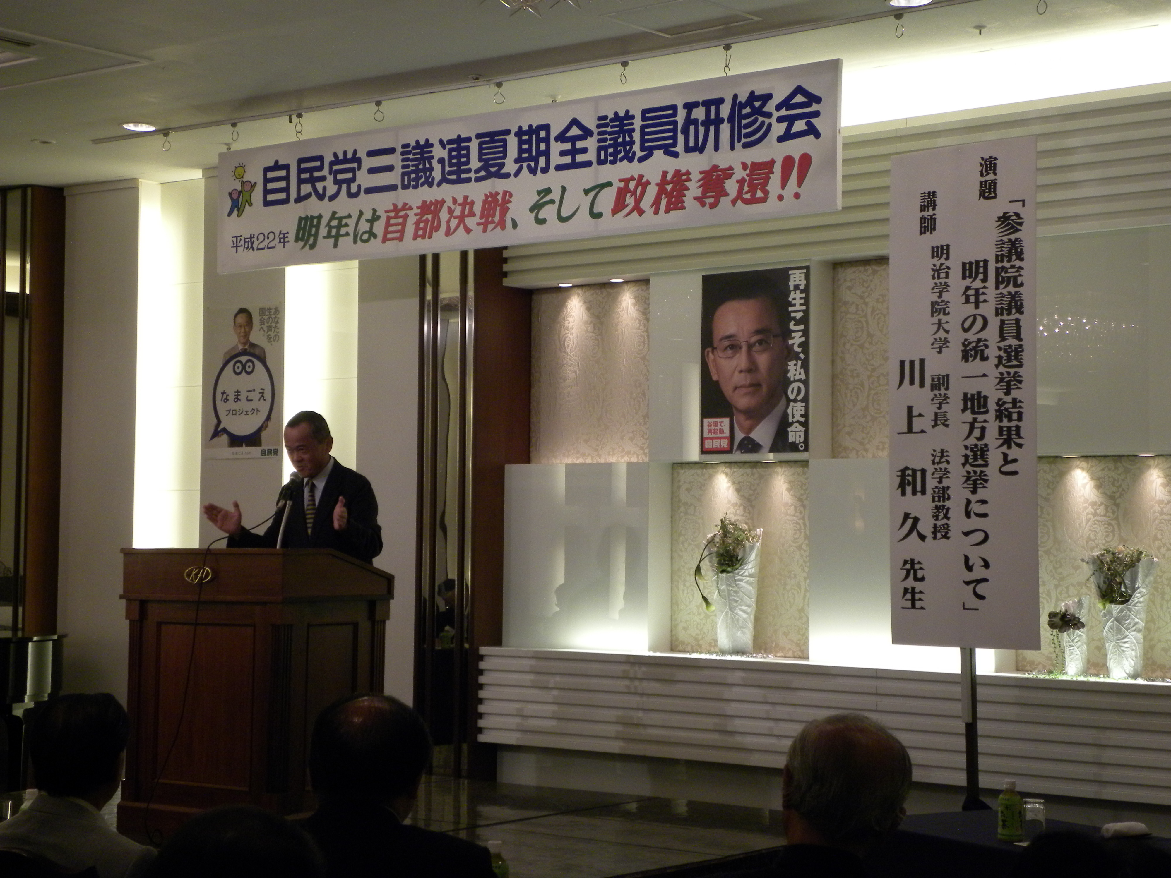 今日はTVでもお馴染みの政治学者で、明治学院大学法学部の川上和久教授から「参議院議員選挙結果と来年の統一地方選挙について」の講義を伺いました。
