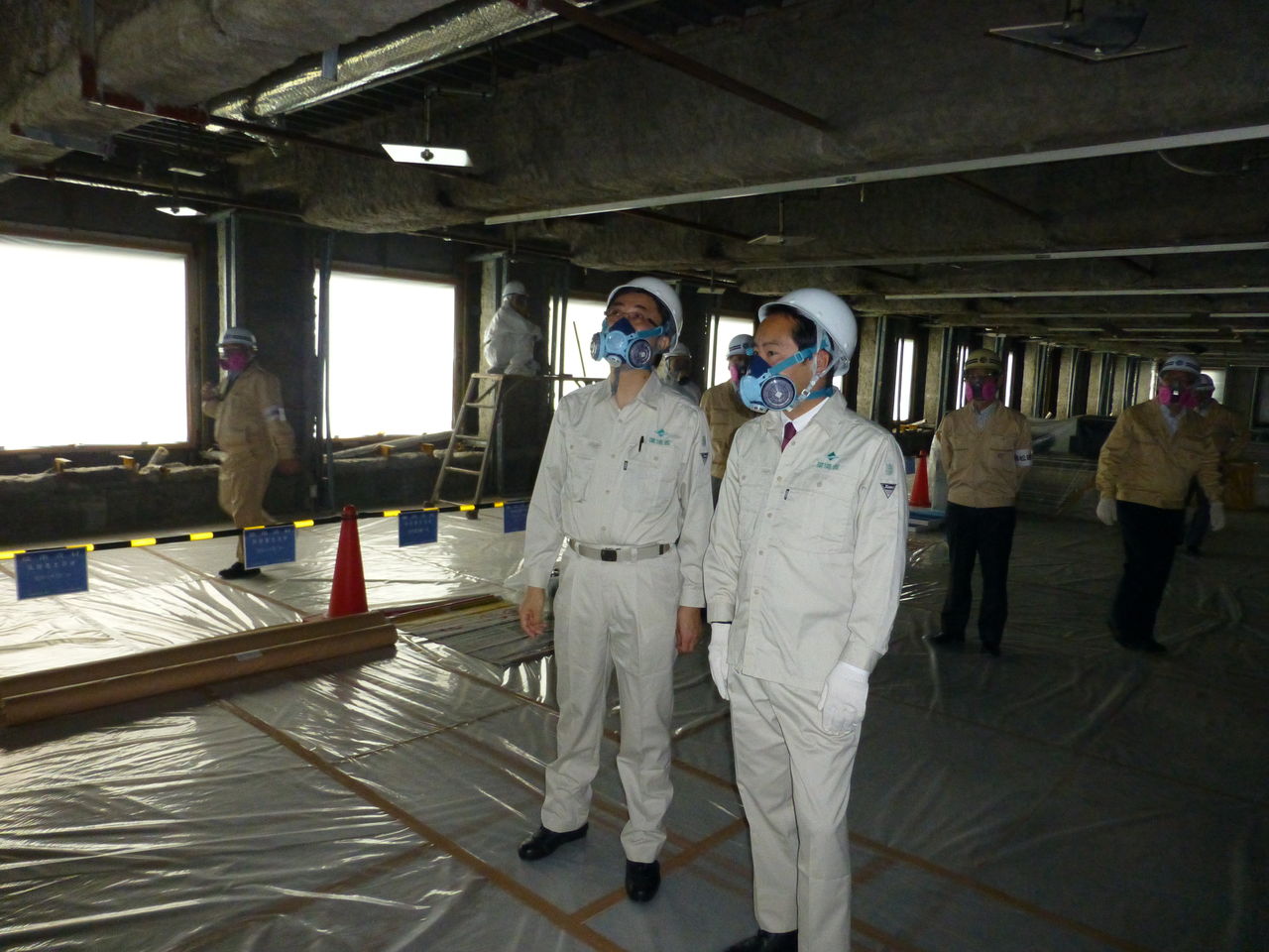 今日は、そのアスベスト除去の現場を視察しようと、環境省からもすぐ近くの御成門にある旧パナソニックビルの解体現場に行ってきました。正直言って、驚きました!まるで福島第一原発のように、作業員の方たちが防護服、マスク、ヘルメット、手袋と完全防護服で、完全密閉された蒸し暑い現場の中で、かなりローテクな手作業でがんばっていました。