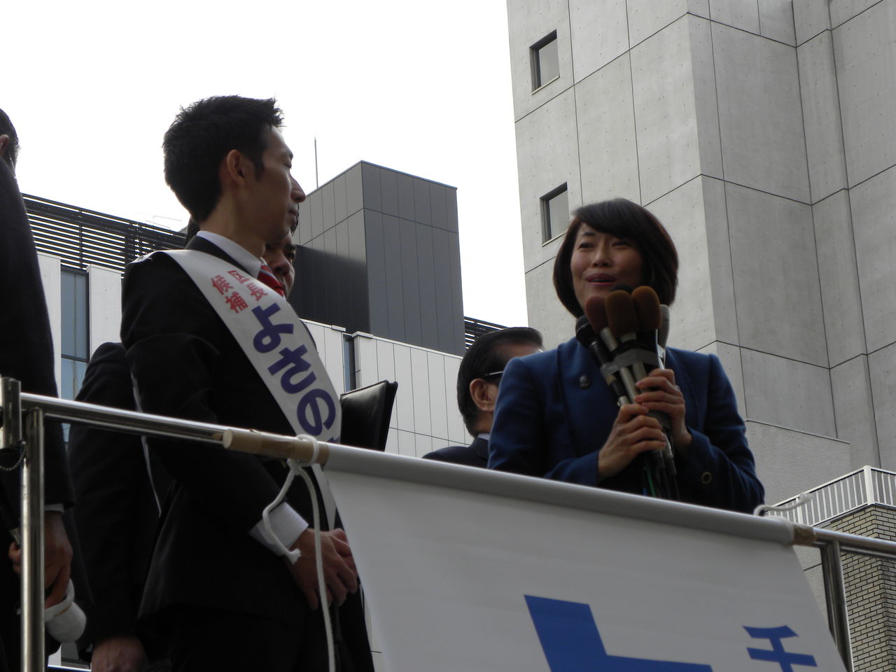 実は、政治経験のないよさの信候補は、今まで街頭演説を行ったことがありませんでした。しかし、これから選挙を迎えるに当たって、若くて情熱はあるが知名度のないよさの信候補にとっては、不特定多数の有権者に対して、街頭で自分の熱い思いを訴えることが一番大切であると考え、先輩ヅラして(?)、街頭に引っ張り出したのです。