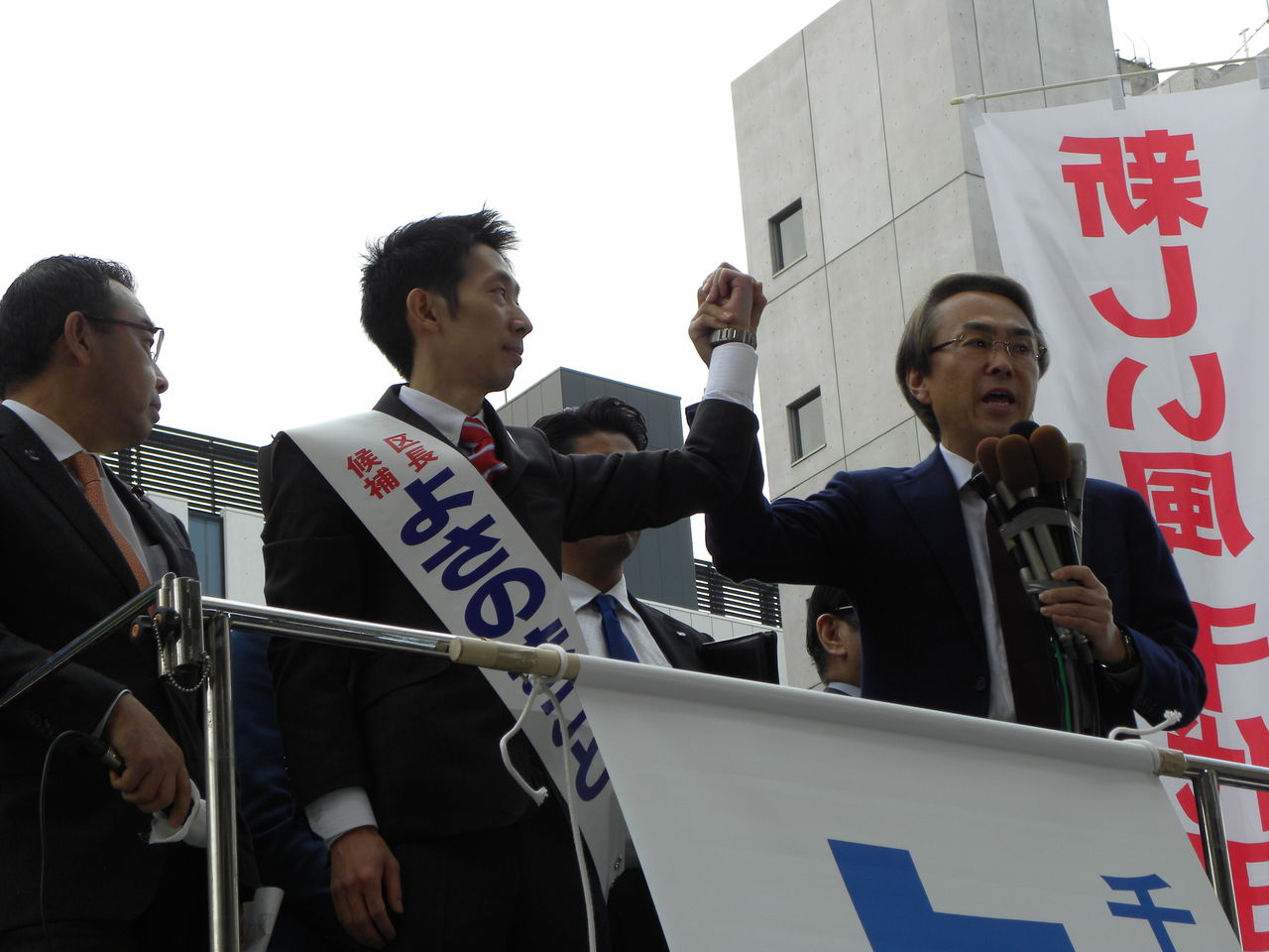 千代田区長選挙の立候補予定者であるよさの信さんの応援に行ってきました。神田神保町に借りた事務所の前で、よさの信候補と一緒に街頭演説を行いました。