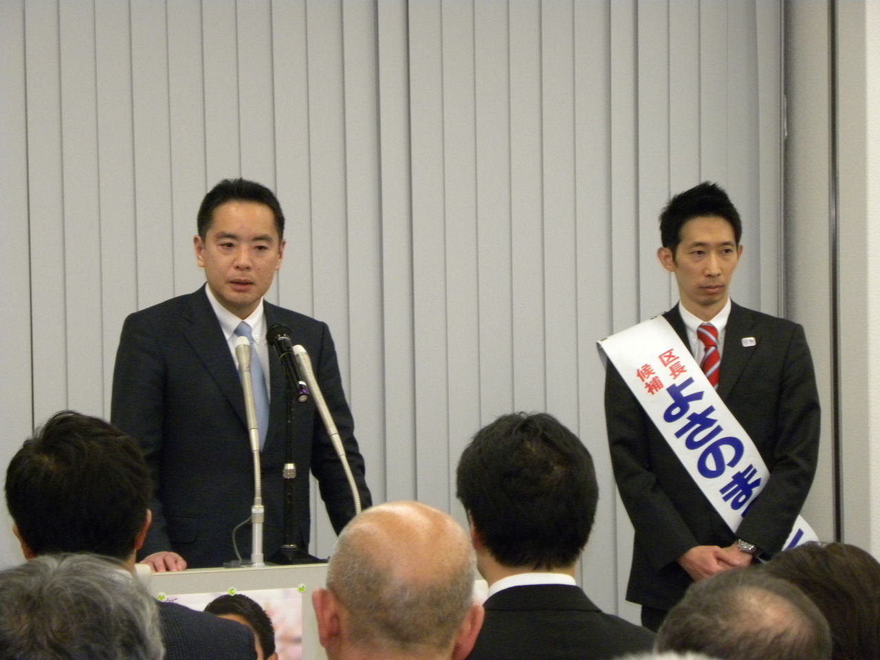 初日の今日は、12:00〜神保町の選挙事務所において、石原伸晃、丸川珠代両大臣にも来てもらい、出陣式を行いました。相手はベテランの現職区長に人気抜群の小池百合子知事が応援するという大変厳しい選挙です。しかし、それでも千代田区を変えたいという、決死の覚悟で立候補した、「よさの信」候補の若く熱い思いを感じてもらいたいと思います。