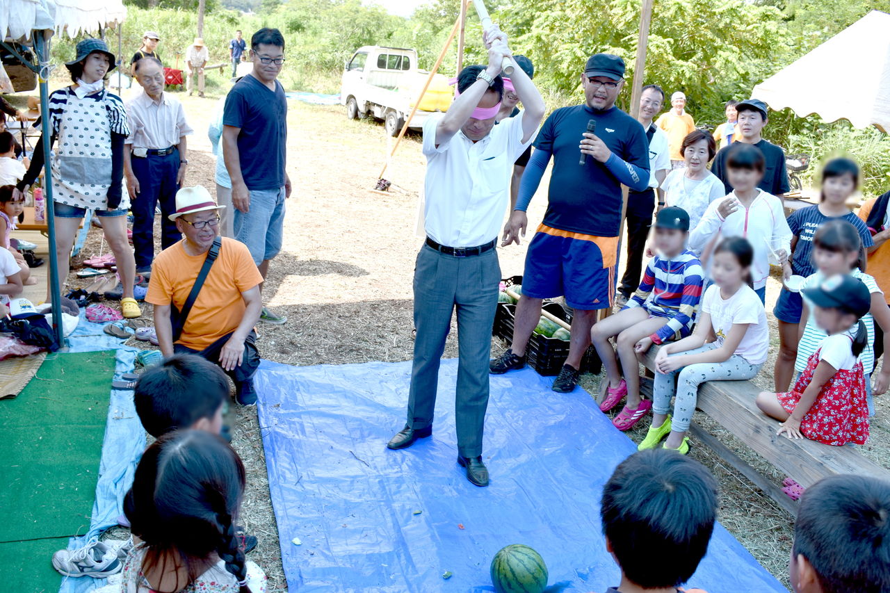 特に、羽村市の多摩川で行われた「マスのつかみどり大会」では、子供たちに混ざってスイカ割りにもチャレンジしました。子供たちの大きな声援のおかげで大きなスイカが見事に真っぷたつに割れました。ただし、次の予定に急がなければならなくて、せっかくのスイカを全く食べることができませんでしたが!?
