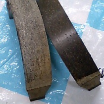 全く効かないフロントブレーキ。厚みは許容範囲でも古くなると硬化して効かなくなるらしい(たぶんホント?)。シューは部品も出ないので、貼替えをしてもらおうとアルカリ洗浄液でゴシゴシ洗っていたら、なんと表面のテカリがとれて新品のような雰囲気に(写真左)。右側の ...
