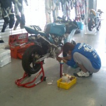 富士SWの本コース(レーシングコース)でミニモトが走るのは初めてのようで、皆さんセッティングに大忙し。