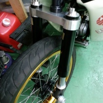 オヤマカブ製作所のオリジナルの倒立フォークとアンダーブラケットを装着した図。正月休み内で間に合いました。パチパチパチ。