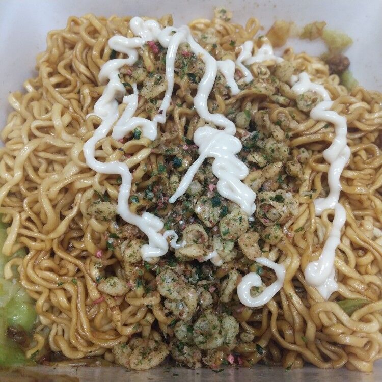 2026年02月17日 明星 一平ちゃん夜店の焼そば 大盛 だしソース味 こんなん美味いに決まっとる。カリカリの揚げ玉に鰹節系出汁ソース。色は微妙だけど出汁マヨネーズもイイネ一平ちゃんはマヨネーズが鬼門だがこれはマッチしてる。うんめ~にゃだわ、2個食えるくらいまいうー タグ :#明星#一平ちゃん夜店の焼そば#大盛#だしソース味