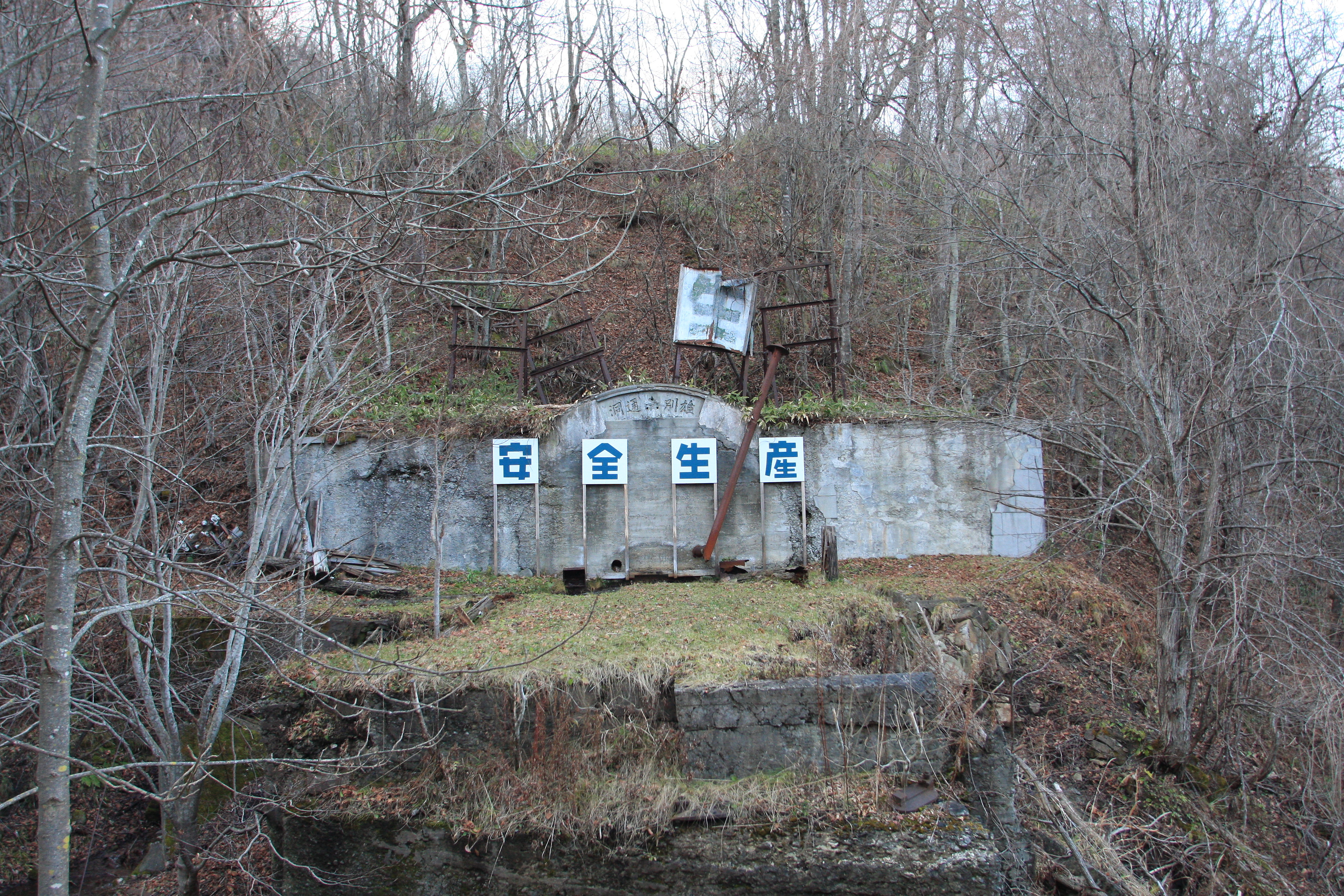閉山になった1970年当時でも1万2千人の人口があった地域で、閉山とともにゴーストタウンになった地域です。道道沿いにも沢山の遺構があり、シンボルともいえる煙突が見えてきます。